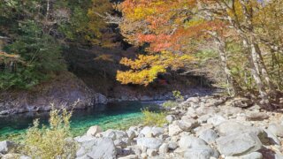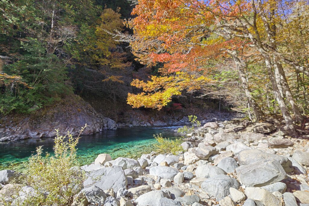 エメラルドグリーン色の川と紅葉の色が鮮やかで、とてもきれいな場所でした(^^)